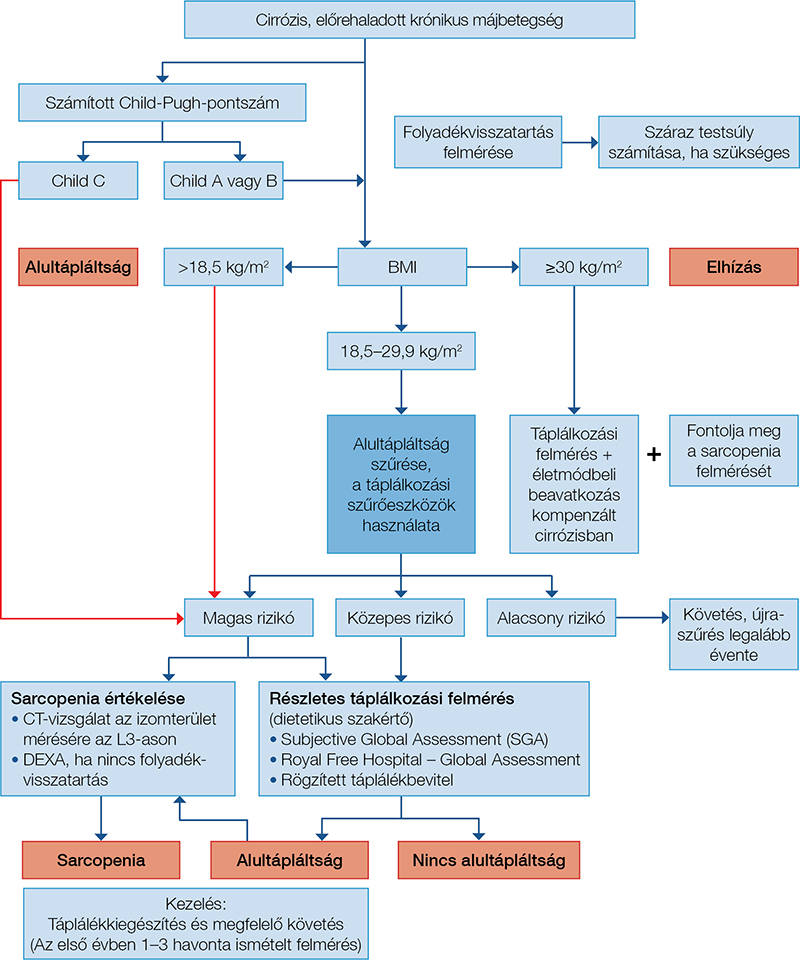 Az EASL 2019-es irányelve foglalja össze a tápláltság szűrését és értékelését májcirrózisos betegeknél, illetve az ehhez kapcsolódó ajánlásait (1. ábra) (3).