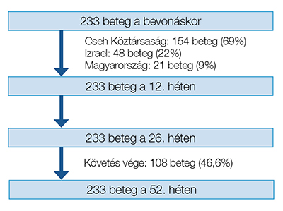 Összesen 223 fő, CD-ben szenvedő beteg adatait elemeztük (férfi/nő arány 0,48); az utánkövetési idő mediánja 51,9 hét (IQR: 48–53) volt. A betegek 69%-át (154/223), 22%-át (48/223) és 9%-át (21/223) a Cseh Köztársaság, Izrael és Magyarország centrumaiban kezelték. A bevonáskor a medián életkor 39 év (IQR: 33–49) és a betegségük medián időtartama 13 év (IQR: 7–21) volt. A betegek körülbelül háromnegyede (75,7%) nem dohányzott. Összesen a páciensek 69,1%-át nagy betegforgalmú tercier központban kezelték. A betegbevonás és utánkövetés folyamatábrája az 1. ábrán látható.