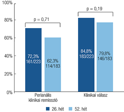 A 26. hétre reagáló betegek körében hasonló csökkenés igazolódott. Az aktív perianális betegség aránya azonban nem csökkent a 26. héten a sikertelen kezelést tapasztalók körében. A 3. ábra az aktív perianális betegségben szenvedő betegek arányát mutatja a kiindulási időpontban, valamint a 12., a 26. és az 52. héten mért adatok szerint.