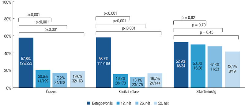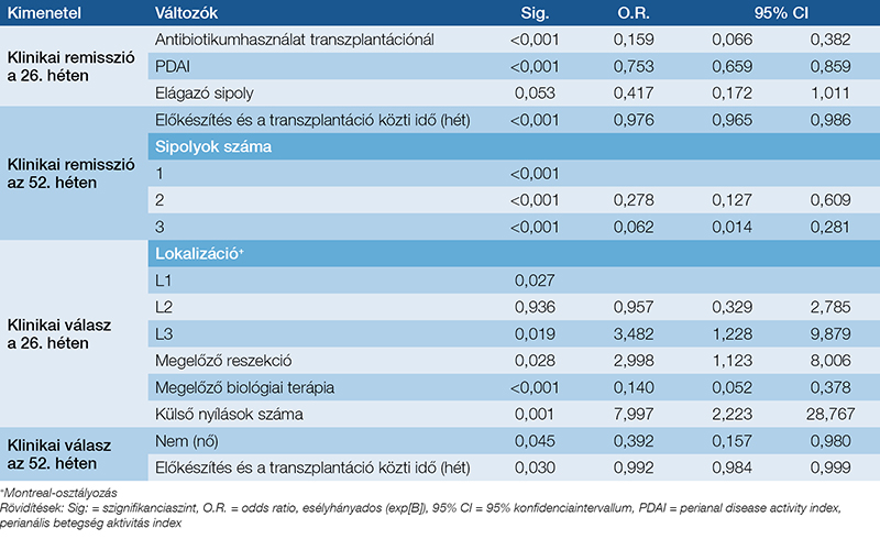 Összesen a betegek 100%-ának, illetve 82,1%-ának adatai álltak rendelkezésre a 26. és az 52. héten. A betegek 72,2%-a (161/223) és 62,3%-a (114/183) a 26., illetve az 52. hétre klinikai remisszióba került. Az 52. heti klinikai remisszió kapcsolatot mutatott a beavatkozás időszakában alkalmazott antibiotikumhasználattal (OR: 0,159; 95% CI: 0,066–0,382), a kiindulási PDAI-pontszámmal (OR: 0,753; 95% CI: 0,659–0,859) és az elágazó fisztulák jelenlétével (OR: 0,417; 95% CI: 0,172–1,011), míg a 26. heti remissziós kimenetel az előkészítés és a transzplantációs műtét között eltelt idővel (OR: 0,976; 95% CI: 0,965–0,986) és a kiindulási fisztulák alacsony számával (OR: 0,278; 95% CI: 0,127–0,609) párosult. Az elsődleges eredmények elérése gyakrabban volt megfigyelhető a nagy betegforgalmú központokban a 26. héten (82,5% vs. 49,3%; X2=26,153; p <0,001) és az 52. héten (72,0% vs. 41,4%; X2=15,815; p <0,001). A klinikai válasz aránya 84,8% (189/223) és 79,8% (146/183) volt a 26. és az 52. héten. A 26. héten a klinikai válaszarányok összefüggésbe hozhatók voltak a betegség ileocolicus lokalizációjával (OR: 3,482; 95% CI: 1,228–9,879), a bélreszekcióval (OR: 2,998; 95% CI: 1,123–8,006), a külső fisztulanyílások számával (OR: 7,997; 95% CI: 2,223–28,767) és az előzőleg alkalmazott biológiai terápiával (OR: 0,140; 95% CI: 0,052–0,378). A kezelés sikertelensége az 52. héten összefüggött a női nemmel (OR: 0,392; 95% CI: 0,157– 0,980) és a transzplantációs műtét elhúzódásával (OR: 0,992; 95% CI: 0,984–0,999). Sem a klinikai remissziós arányok (X2=0,143; p=0,71), sem a klinikai válaszok aránya (X2=1,722; p=0,19) nem változtak az 52. hétig. A 2. táblázat a modellszelekciót követő, többváltozós regressszió prediktív eredményeit mutatja be. A 2. ábra a 26. és az 52. héten mért perianális klinikai remissziót elérő betegek arányára vonatkozó adatokat mutatja be. A bevonáskor a betegek 57,8 %-ának (129/223) volt aktív perianális betegsége (PDAI >4). Ez az arány 20,6%-ra (41/199; X2=60,638; p<0,001), 17,2%-ra (34/198, X2=32,596; p<0,001), és 19,6%-ra (32/163; X2=56,566; p<0,001) csökkent a 12., a 26. és az 52. hétre.