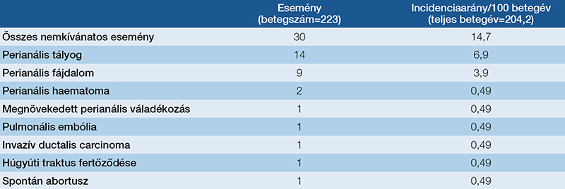 Jelen kohorszunkban a biztonságossági profil megnyugtató volt, az AE-k összesített előfordulási aránya 14,7/100 betegév volt. Az esetek többségében tályogról és proctalgiáról számoltak be, ami összhangban van az ADMIRE-CD vizsgálat eredményeivel. Egy svájci kohorszban herekarcinómáról és citomegalovírus által okozott fertőzésről közöltek adatokat (15), míg a vizsgálatunkban az emlő invazív ductalis karcinómáját és a húgyutakban kialakuló fertőzést figyelték meg. Ezen mellékhatások darvadstrocelkezeléssel való összefüggése azonban valószínűtlen. Emellett egy esetben tüdőembóliát regisztráltak, ami összefüggésbe hozható lehet a műtéti eljárással és a kórházi felvétellel. Ezen eredmények arra utalnak, hogy az MSC-kezelés jól tolerálható.