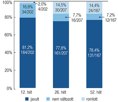 Fontos kiemelni, hogy a betegek 81,2%-a (164/202), 77,8% (161/207) és 78,4%-a (131/167) tapasztalt javulást a szubjektív tünetekben, míg 16,8%-a (34/202), 7,7%-a (16/207) és 7,2%-a (12/167) nem tapasztalt változást a 12., a 26. és az 52. hétig. A 4. ábra a betegek tapasztalatait mutatja be.