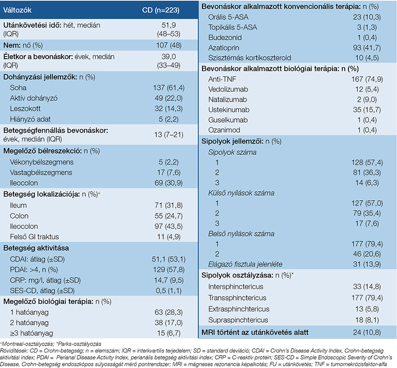 A leggyakoribb lokalizáció az ileocolon (43,5%) volt, és a betegek 40,7%-a korábban már átesett bélreszekción. A kohorsz többsége (91,5%) a kiindulási időpontban klinikai remisszióban volt. Emellett a betegek 41,7%-ánál alkalmaztak immunmodulátort, míg több mint háromnegyedük anti-TNF-kezelésben részesült. A betegek 57,4%-ának felvételkor egy sipolyjárata volt; a sipolyjáratok többsége transsphinctericus lokalizációjú volt. Elágazó sipolyjáratokat az esetek 13,9%-ában regisztráltak. A betegek több mint felénél a PDAI-pontszám <4 volt (57,8%). A klinikai és demográfiai alap adatokat az 1. táblázat tartalmazza.