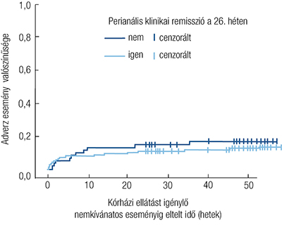 Összességében 204 betegévet regisztráltunk, míg 13,5%-ban (14,7/100 betegév) jelent meg kórházi kezelést igénylő AE a követés során. Az AE-k megjelenéséig eltelt idő mediánja 51,1 hét (IQR: 27,9–52,9) volt a kezelés után. Az AE-k előfordulása azonos volt a 26. héten elért perianális klinikai remisszió szerint rétegzett csoportok esetében (X2=0,522; p=0,47). Az AE-k előfordulása kapcsolatot mutatott a magasabb kiindulási PDAI-pontszámmal (HR: 1,148; 95% CI: 1,021–1,290), míg az aktív dohányzás (HR: 0,227; 95% CI: 0,054–0,957) csökkent kockázattal párosult. A 3. táblázat az AE-k további részleteit mutatja be, míg az 5. ábra az AE-k megjelenéséig eltelt idő görbéjét szemlélteti a 26. héten bekövetkezett perianális klinikai remisszió szerint.