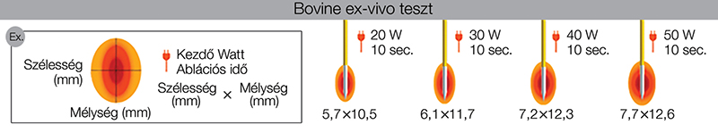 1. ábra: 7 mm-es, monopoláris RFA-elektródán át különböző teljesítmények szöveti penetrációja ex vivo modellben (https://starmed-america.com/eusra-eus-guided-rf-electrode/)