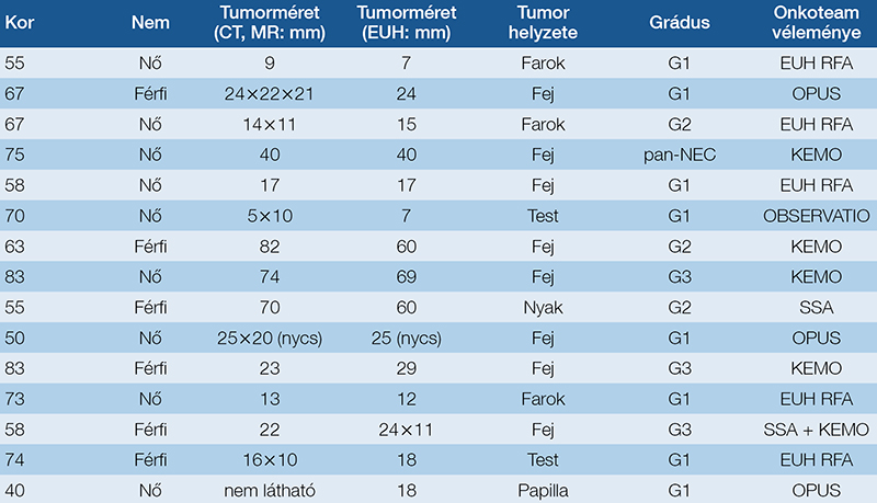 Az Országos Onkológiai Intézet EUH/ERCP laborjában 2024-ben összesen 17 betegnél diagnosztizáltunk hasnyálmirigy eredetű neuroendokrin tumort; a daganatok minden esetben hormonálisan inaktívak voltak. A szövettani mintához EUH által vezérelt vékonytű-biopsziával (FNB) jutottunk. A betegágy melletti citológiai véleményezés után sejtblokkfeldolgozással állítottuk fel a végleges diagnózist. Az esetek adatai alapján a további terápiás terv megállapítását egy multidiszciplináris onkológiai team véleménye alapján végeztük, figyelembe véve a beteg egyéni preferenciáját is (1. táblázat):