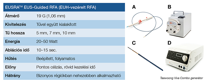 Az RFA ezenkívül a tumorantigének felszabadításával T-sejtek által mediált immunválaszt vált ki, ami apoptózis révén potenciálisan daganatellenes immunitáshoz vezet (10, 11). A technika klinikumban való alkalmazása perkután megközelítésből az 1990-es évek óta folyamatosan bővül; időközben a hepatocellularis karcinóma kezelésének egyik alappillérévé vált, ezt nemzetközi irányelvek is megállapították (12). Továbbá régóta alkalmazzák tüdő-, csont-, prosztata- és vesedaganatok esetében is. Endoszkópos alkalmazását előbb az ERCP-technikával kombinálták; legfőbb indikációi közé tartoznak a rosszindulatú epeúti vezetékszűkületek, valamint az elzáródott palliatív fémstentek rekanalizációja a stent eltávolítása nélkül (13, 14). Az intraductalisan alkalmazott technika a klinikai kihívást jelentő májkapui szűkületeknél behelyezett (nem cserélhető) bilaterális stentelzáródás esetén mutatott kifejezett előnyt (15). EUH-vezérelt alkalmazás tekintetében 1999-ben Brugge és munkatársai publikálták az első kísérletes, en­doszkópos ultrahang által vezérelt RFA-t sertésmodellben (16). A kísérletes modellek után évekig tartott a hatékony ultrahangos endoszkópok és RFA-eszközök fejlesztése. 2015-ben került kereskedelmi forgalomba az első EUSRA-rendszer, amely az echoendoszkóp munkacsatornáján bevezethető, vízhűtéses, különböző aktív véghosszúságú, monopoláris, 18 G (később 19 G) rádiófrekvenciás tűből; egy dedikált radiofrekvenciás VIVA RF-generátorból; valamint egy, a tű belsejében hűtő sóoldatot keringető pumpából áll (2. ábra).