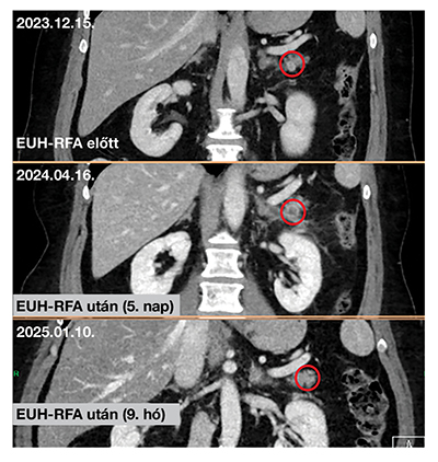 Az RFA-t mind az 5 esetben sikeresen elvégeztük. A beavatkozással közvetlen összefüggésben álló korai szövődményt egy alkalommal sem észleltünk. Egy betegünk a beavatkozást követő ötödik napon hasi fájdalom miatt hospitalizációra szorult; a sürgősséggel elvégzett vizsgálatok perforációt vagy hasnyálmirigy-gyulladást nem igazoltak (amiláz-lipáz normál; CRP: 13,6 mg/dl). Az esetet szúrcsatorna-irritációnak véleményeztük, amely rövid antibiotikumkúra és fájdalomcsillapítás mellett hamar oldódott. Az ablációs kezelés hatására már jól látható volt a tumorban a centrális elhalás a panasz miatt végzett korai CT-felvételeken is. A többi betegünk esetében sem korai, sem késői szövődményt nem regisztráltunk. Az onkológiai utánkövetést klinikai állapotfelmérés mellett kontrasztanyagos, hasi CT-vizsgálatokkal (3, 6 és 12 hónap) és ismételt laborvizsgálatokkal végeztük. Három betegnél az egyéves kontroll képalkotó vizsgálat során az elváltozás teljes vagy részleges (>50%) regressziót mutatott (4. ábra). Egy páciensnél a regresszió mértéke 40%-nak mutatkozott, és a chromogranin A értéke is emelkedett, így itt ismételt RFA-t végeztünk a korábbival megegyező beállításokkal; a további utánkövetéses adatok még nem állnak rendelkezésre. Az utolsó beteg esetében a harmadik hónapnál ismételt CT-vizsgálat során az elváltozás még változatlan méretűnek mutatkozott. Az EUH-RFA-kezelésen átesett betegeink utánkövetését és az új betegek bevonását jelenleg is folytatjuk.